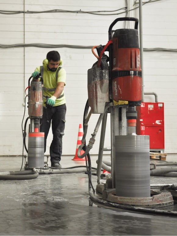 Затем приступаем к алмазной резке бетона на транспортабельные фрагменты весом до 1 тонны. Используем дисковые стенорезные системы HILTI и мощные промышленные пылесосы для уборки воды и шлама на всех этапах работ.